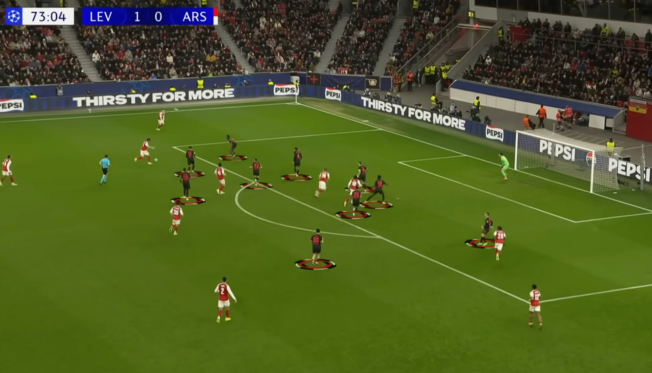 Right after the restart, Raya was forced into a big save from a goal-bound header. The resulting corner led to the opener. Bayer executed a set-piece straight out of our own playbook: a deep delivery to the back post, player who was originally there dragged his marker— Zubimendi—out of position, the second player ran into the opened spaces, the third player made a block on Eze (who went down looking for a foul that never came). It left a free header for the opener. Fair play to them, but you have to wonder why Eze (and not Gyokeres, for example) was tasked with marking Andrich—the man looks like a German lumberjack!