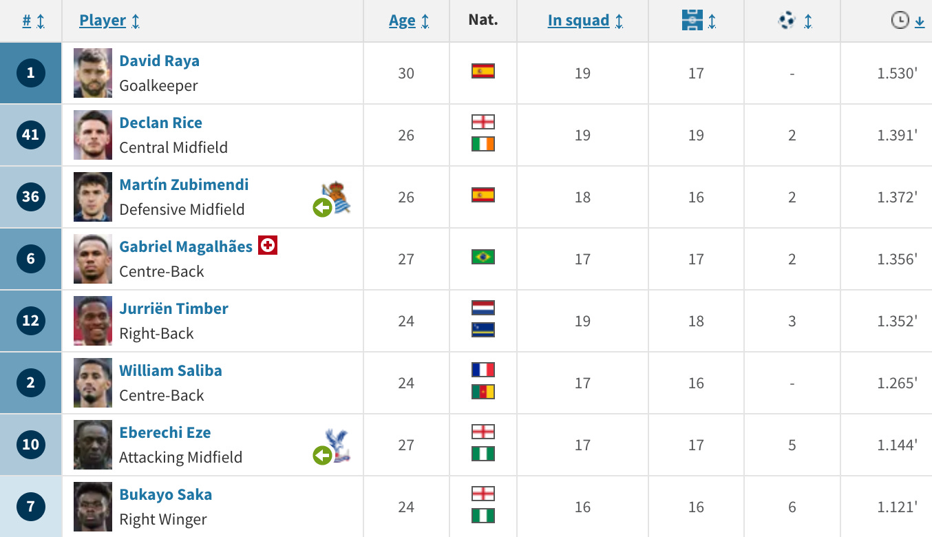 Arteta has done a bit of rotation this season, fair enough. But there are still three players he starts every single time: Zubimendi, Rice, and Timber. Funnily enough, three of our top four for minutes played are the lads I just mentioned, and the fourth is already out injured for up to two months.