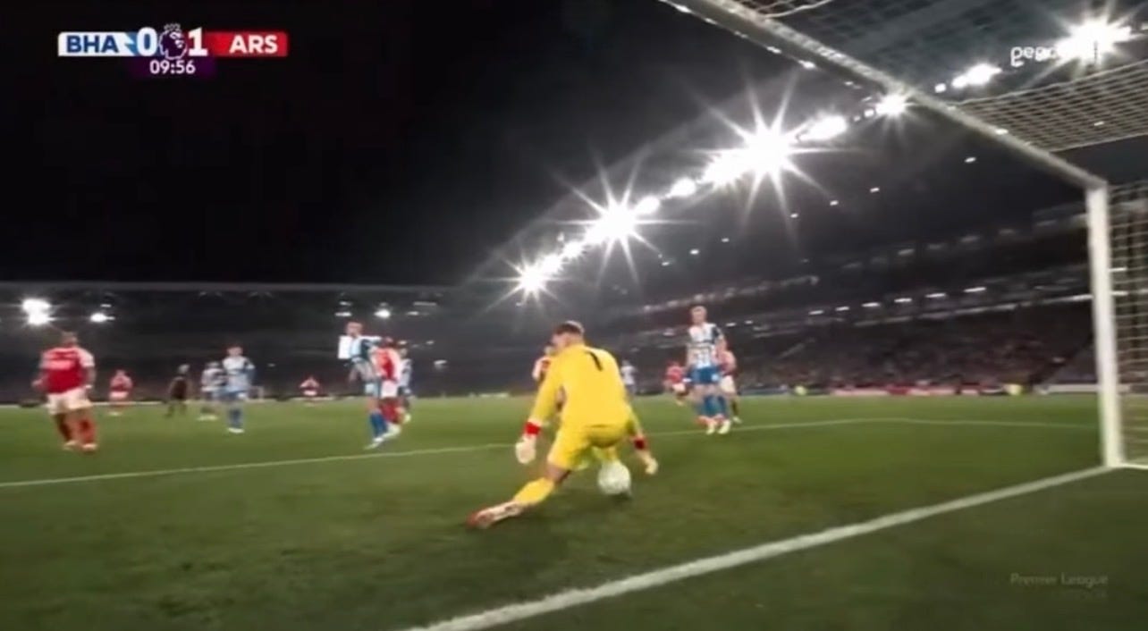 To be fair, the trajectory wasn’t too tricky and Verbruggen should have saved it. And here, despite my earlier criticism, I can confidently say David Raya has the quality and would actually have kept that out. For the rest of the first half, it was mostly Gabriel’s sliding blocks, Rice’s vital touches in the box, and a whole lot of scrapping. The first-half stats made for grim reading for Arsenal: