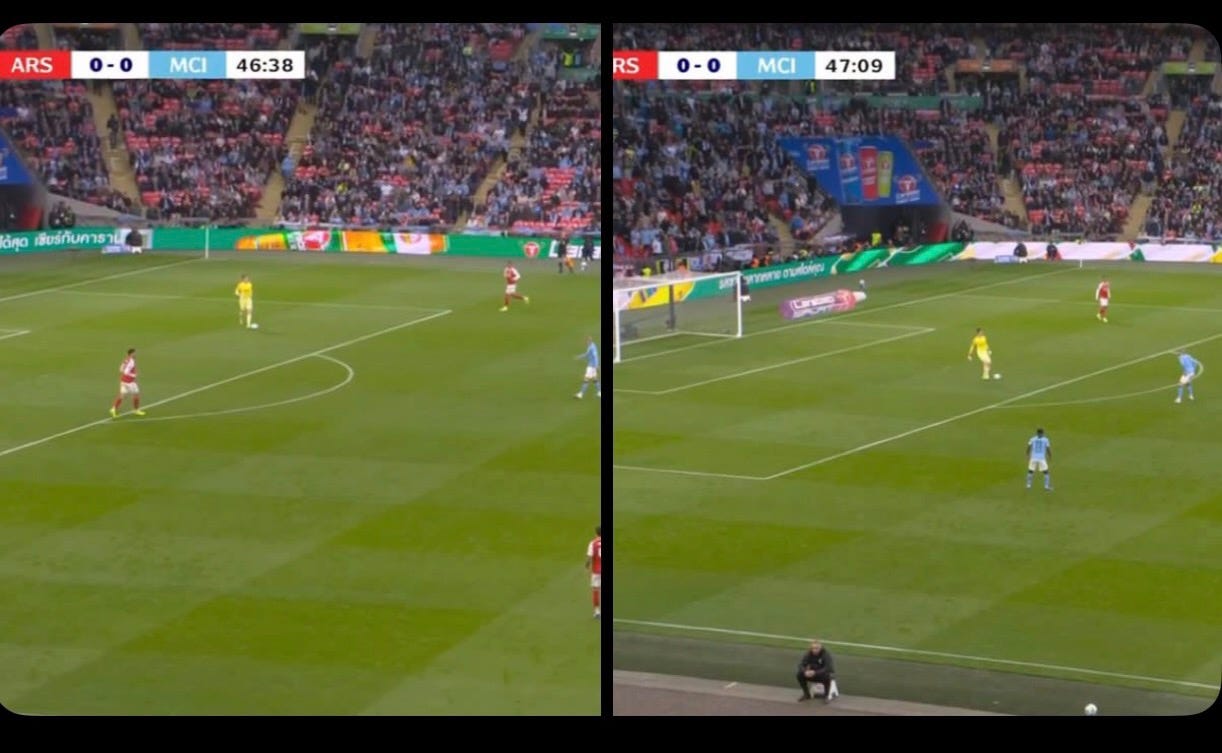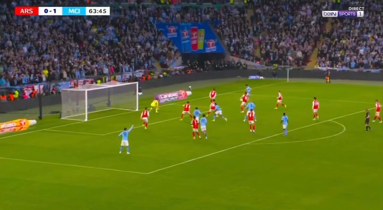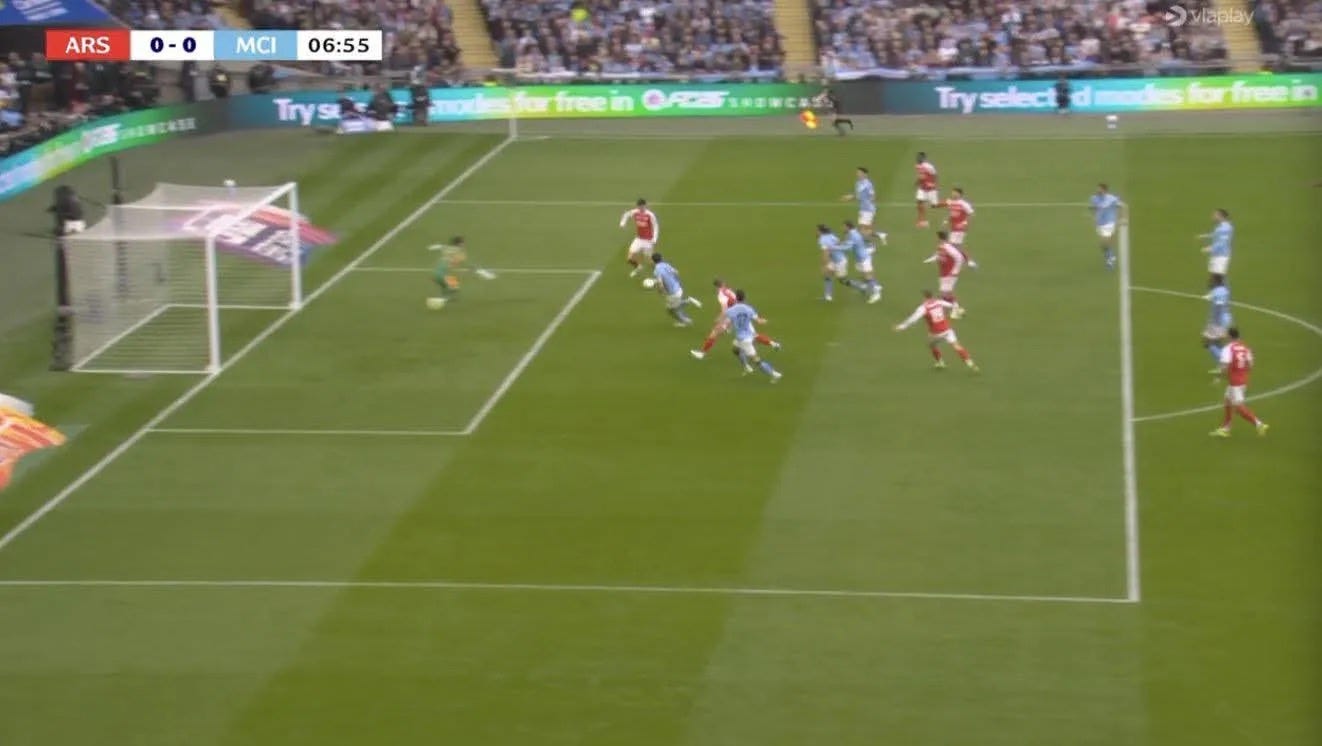 Look how many players City had in the box! It caused our defenders to rotate all over the shop—Saliba at RB, Gabriel at LB, Hincapie in the middle, and Ben White wandering around Doku in the middle of the box. That’s the desire to score, to take the game by the scruff of the neck. I never saw Arsenal commit more than four players in the box, even when we were the better side in the first half.