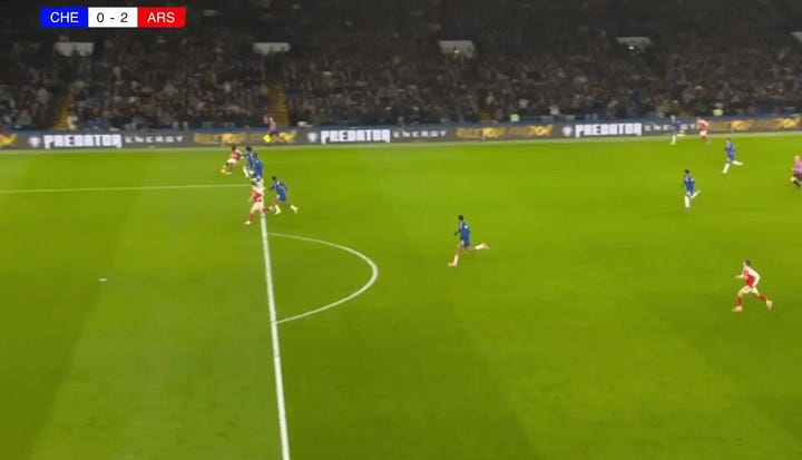 At 2-0 up, it felt like the perfect window to ring the changes and introduce some fresh legs. Arteta opted to wait, however, and Chelsea duly capitalised, dragging themselves back into the tie. The goal itself was a bit of a mess, the result of a series of jammy rebounds. It’s hard to point the finger at any one individual; Garnacho was left unmarked on the right, but White was busy trying to stop Enzo from pulling the trigger, so you can’t really fault Benjamin’s positioning there.