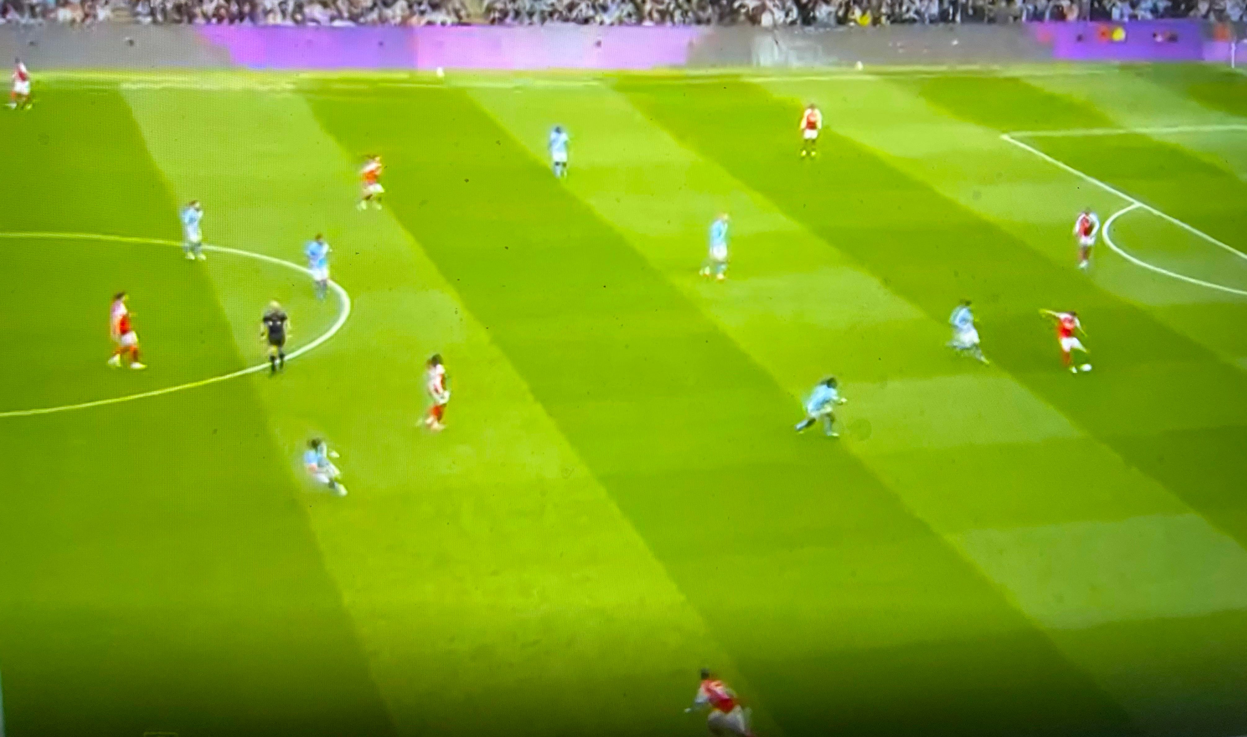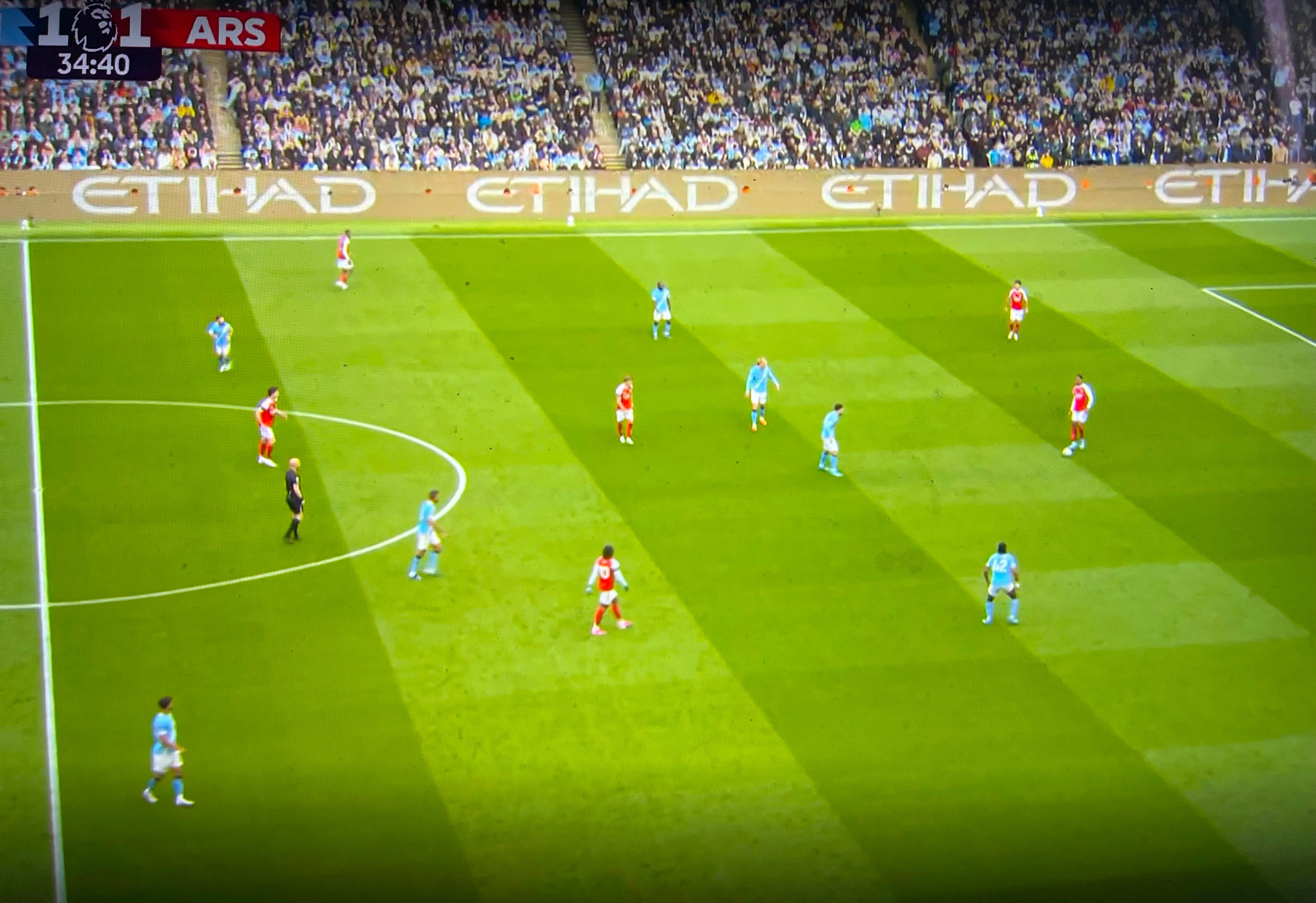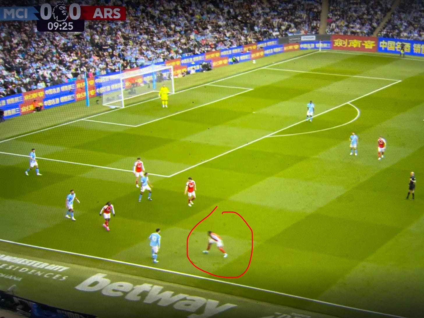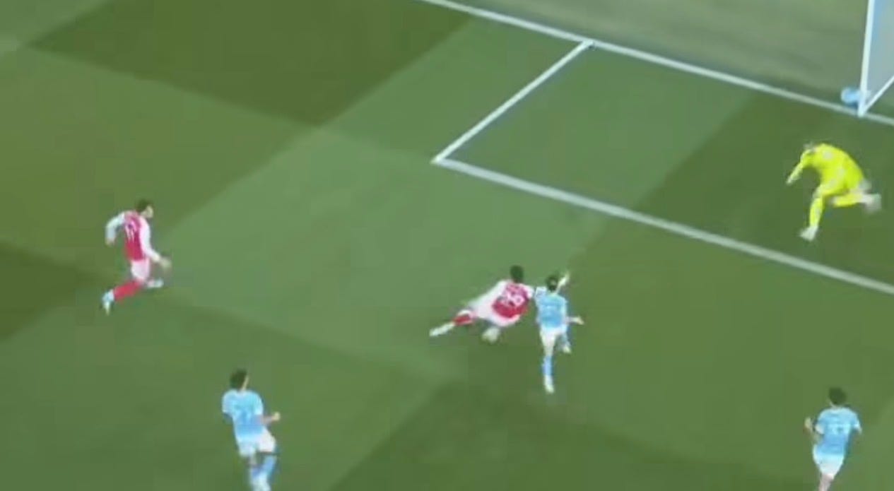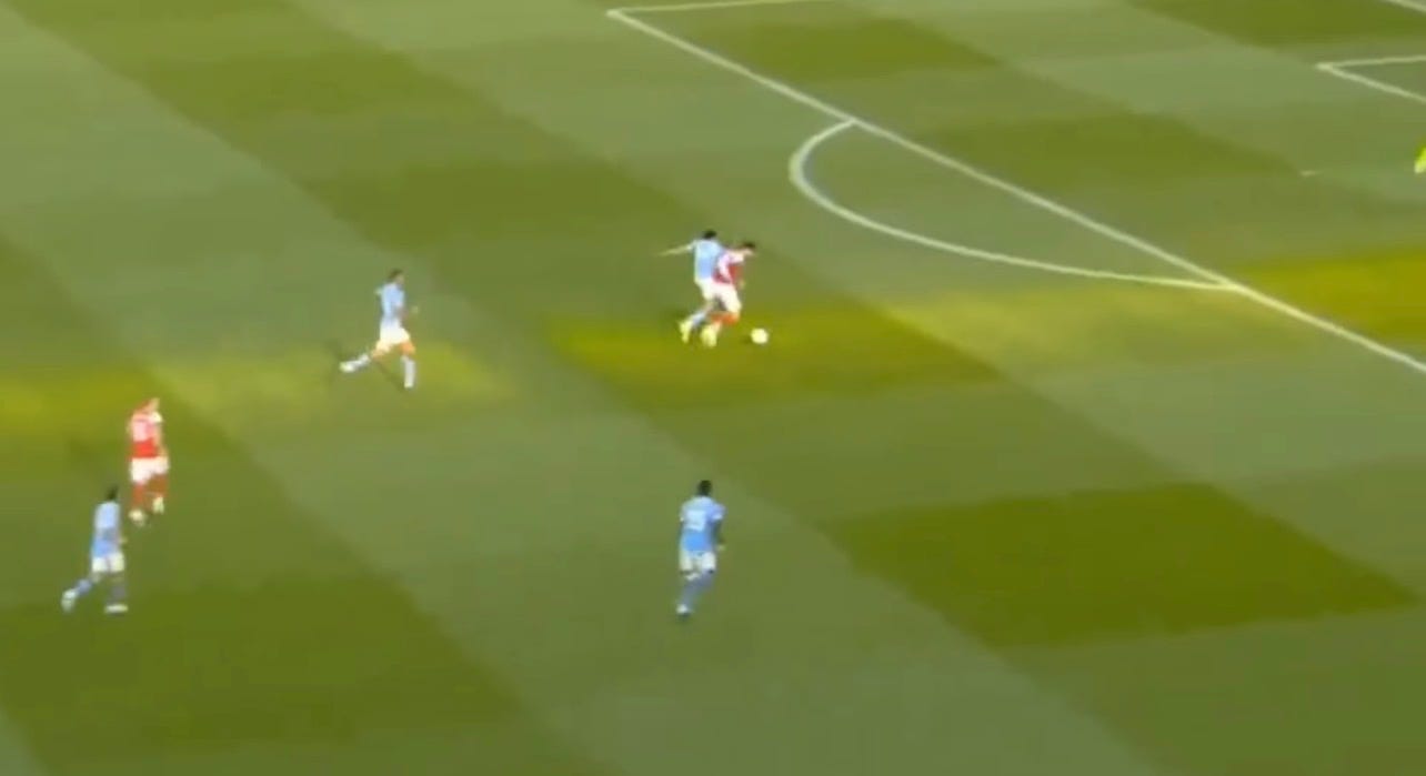 Guardiola had prepared several solutions to unlock our defense. One involved Cherki, who was practically moving freely across the pitch, creating overloads in different areas for which we had no proper answer. Apparently, Gabriel was tasked with tracking him, and at times he ended up far too high up the pitch when attempting to stop Cherki from turning with the ball, as seen in the image below. (I apologise for the quality of the screenshots in this post, but quality images are hard to come by on short notice).