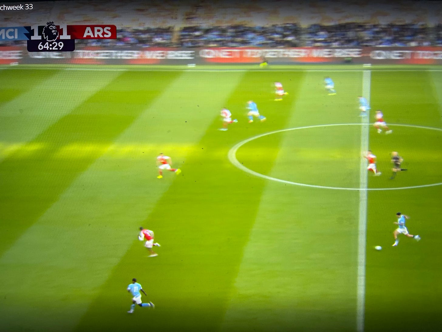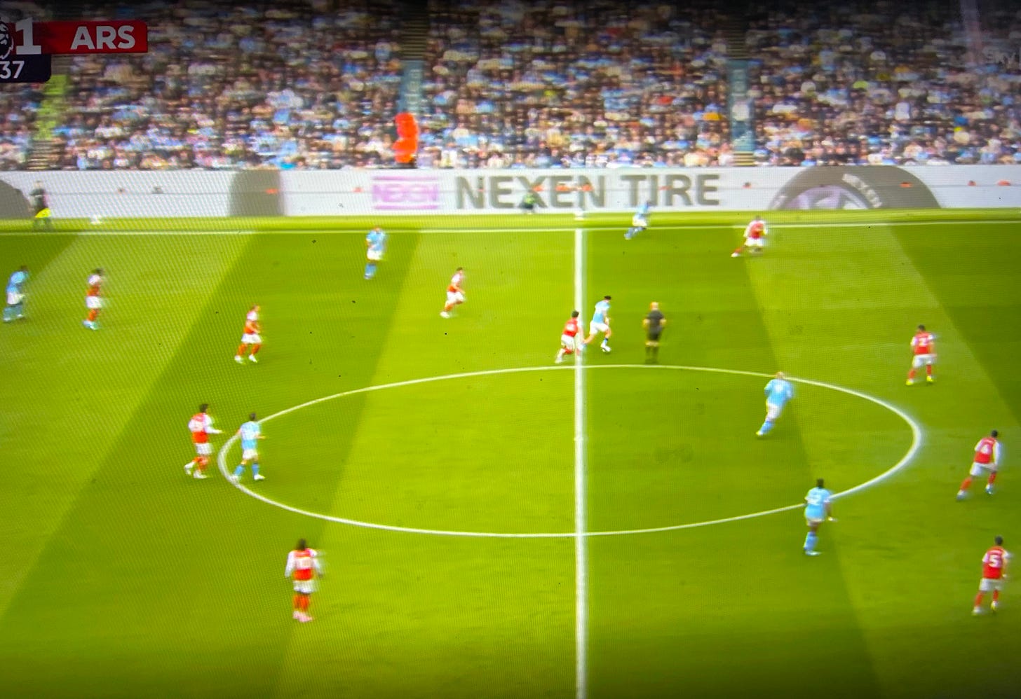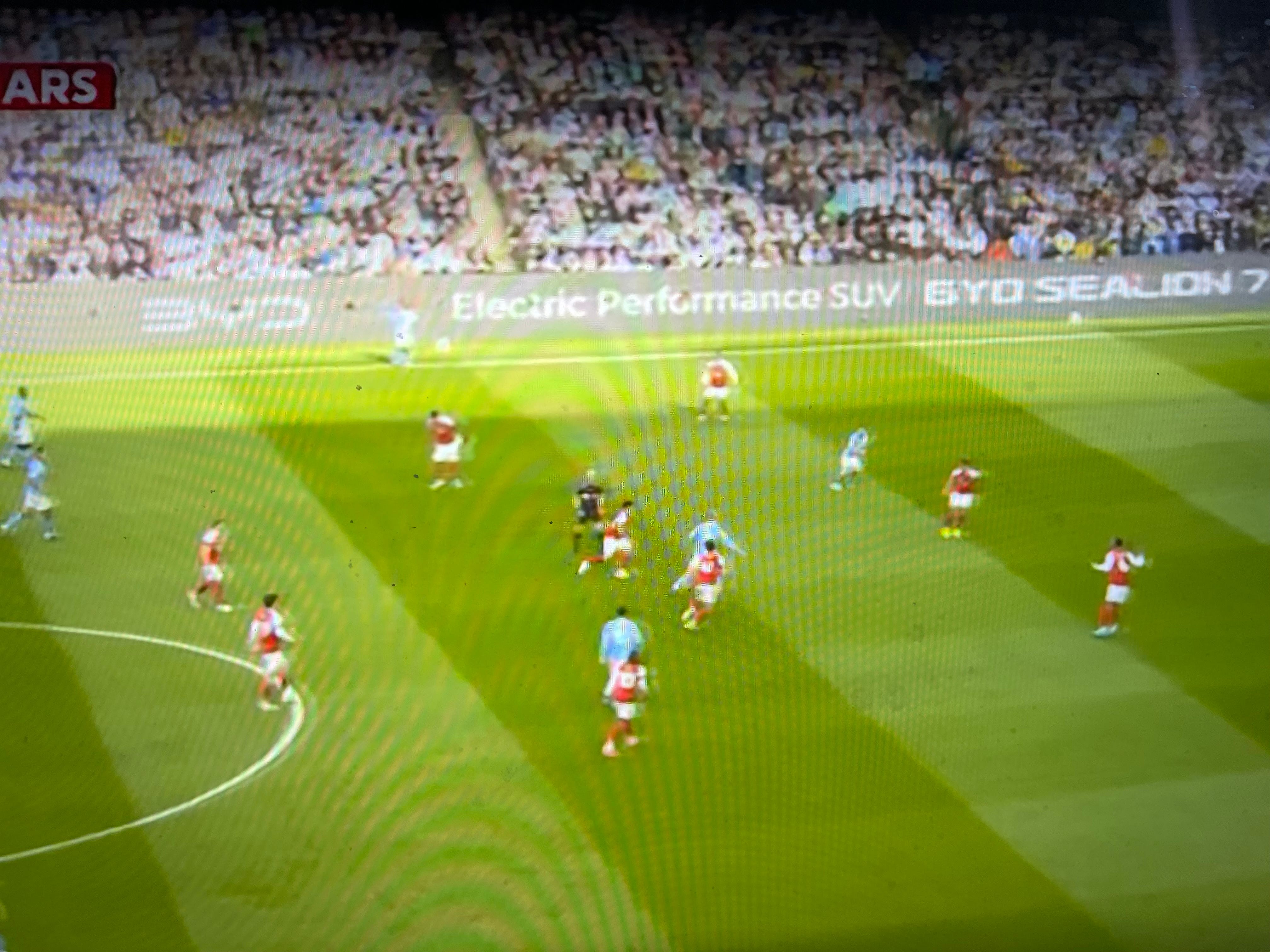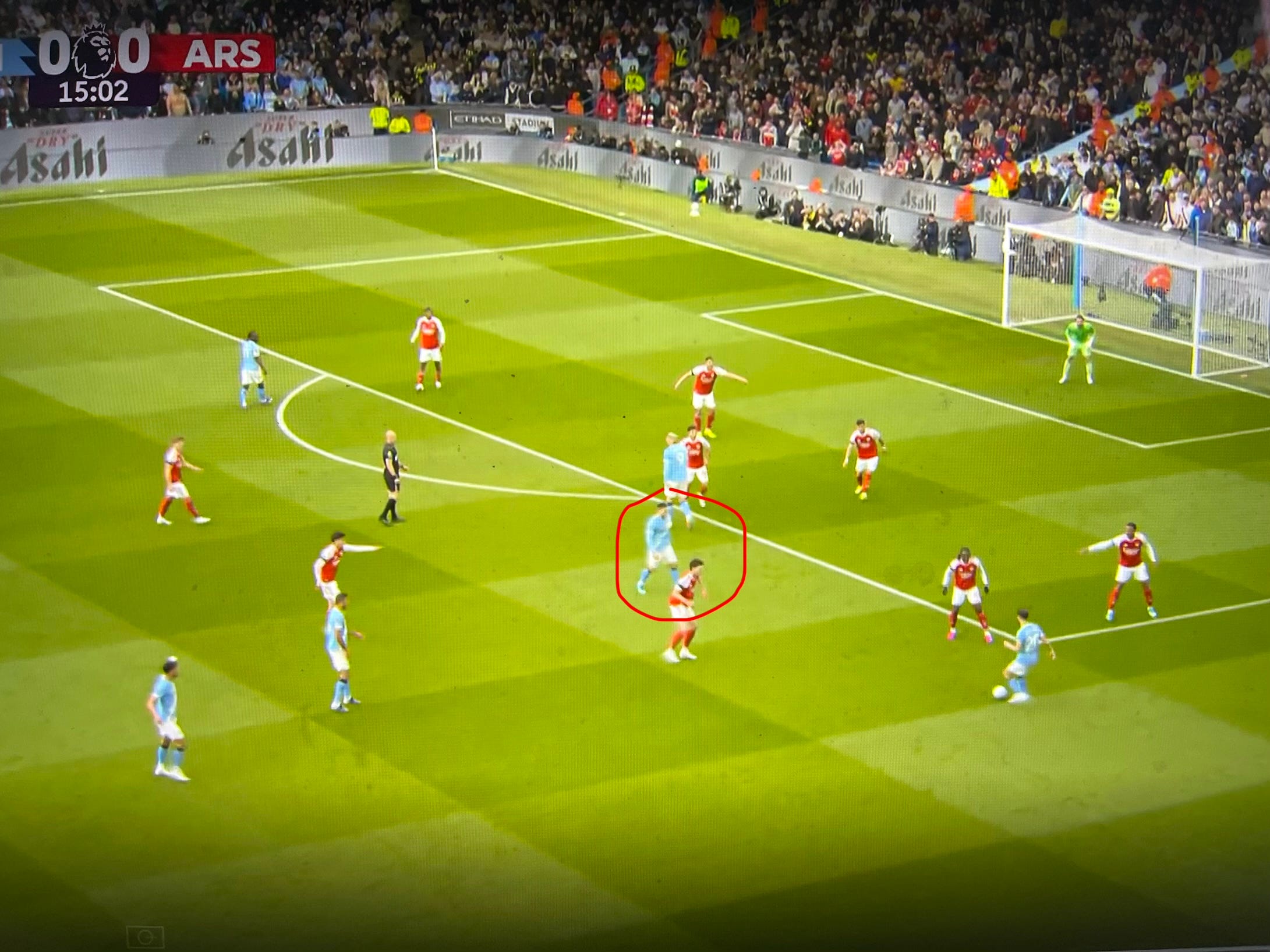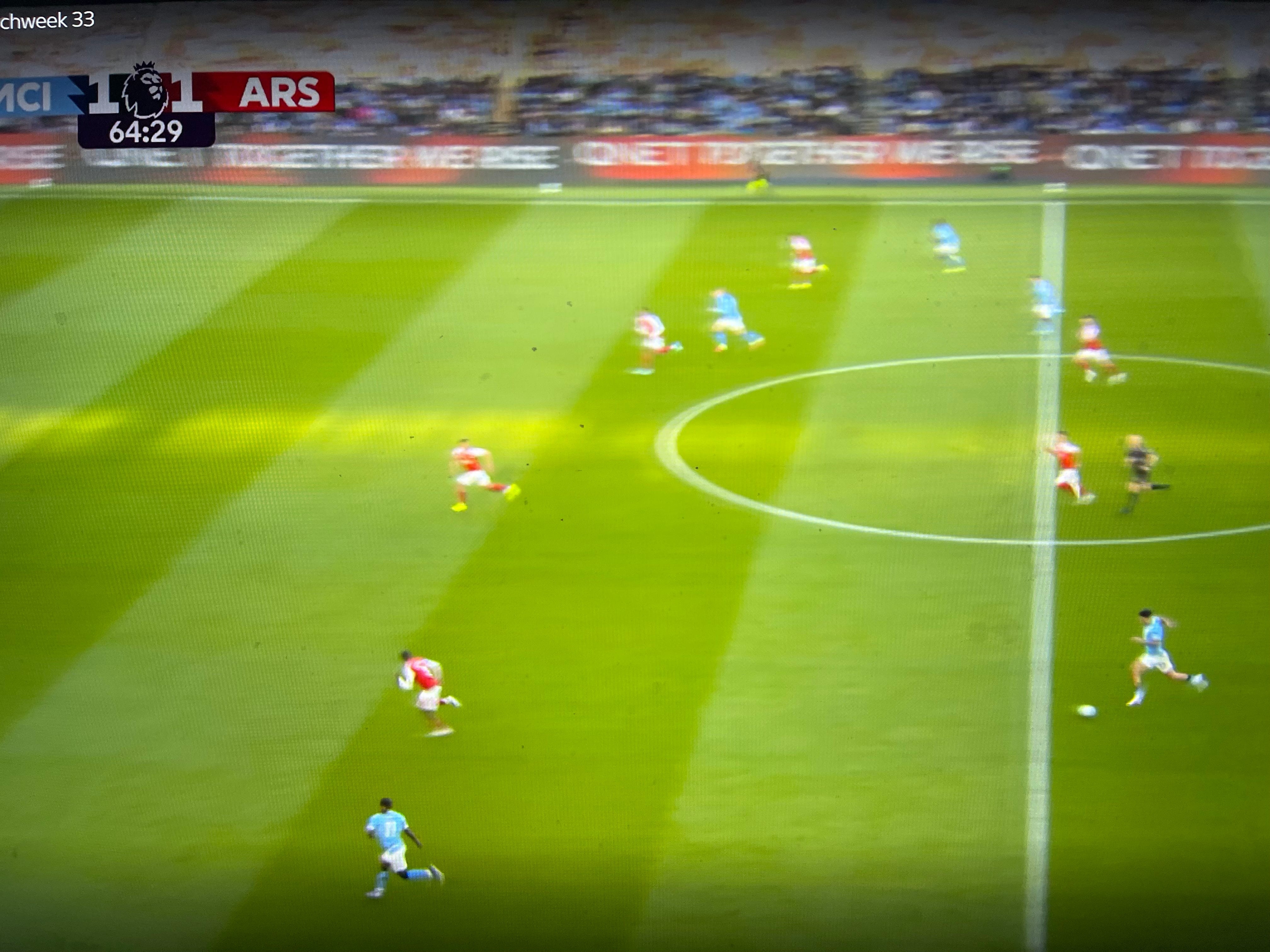 Guardiola had prepared several solutions to unlock our defense. One involved Cherki, who was practically moving freely across the pitch, creating overloads in different areas for which we had no proper answer. Apparently, Gabriel was tasked with tracking him, and at times he ended up far too high up the pitch when attempting to stop Cherki from turning with the ball, as seen in the image below. (I apologise for the quality of the screenshots in this post, but quality images are hard to come by on short notice).