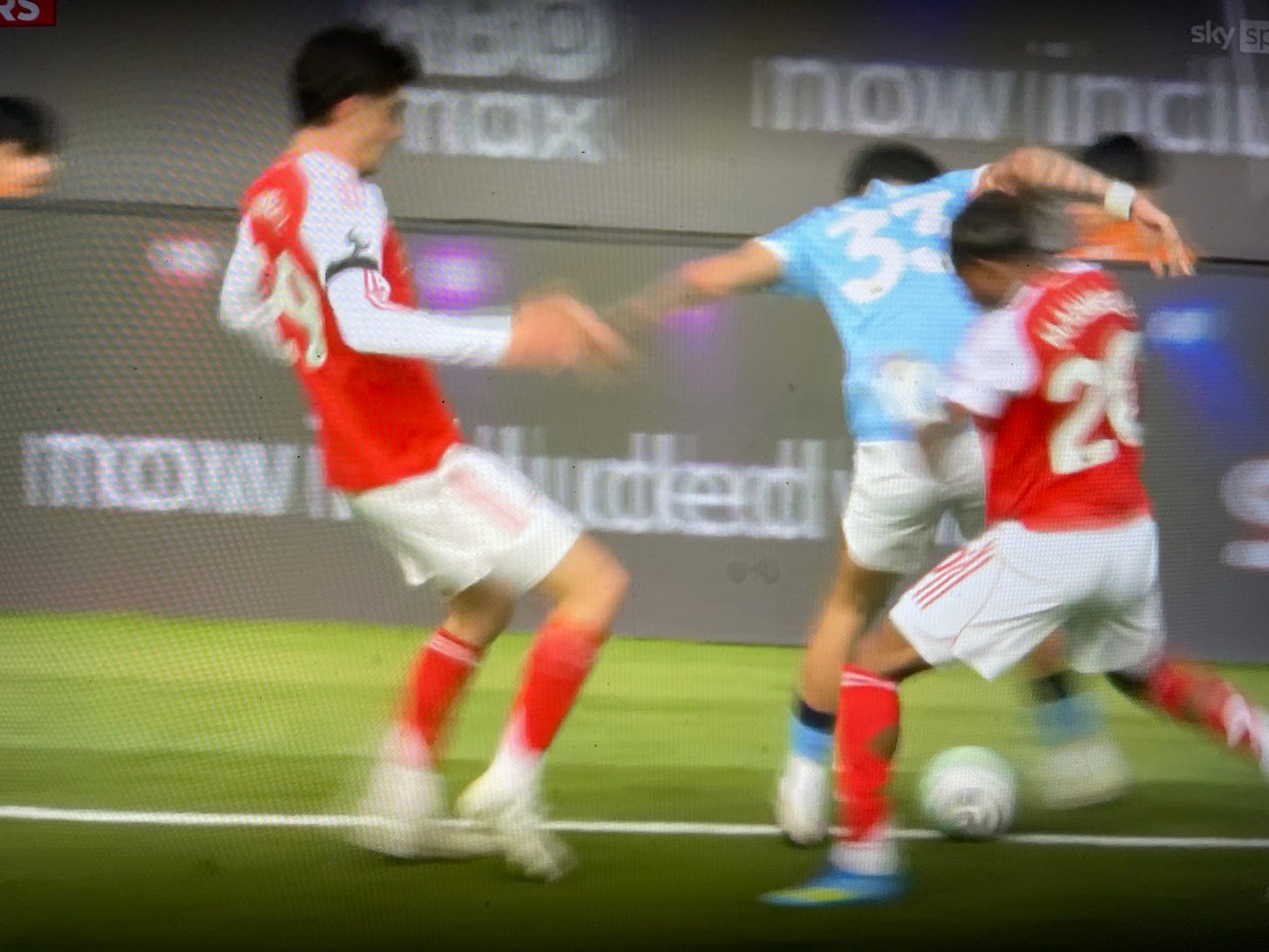 I think this could easily be blown as a foul in some circumstances, because Khusanov is not playing the ball, merely the man, and he’s clearly behind Kai. That said, somehow Havertz, despite his ability to win headers and shield the ball, always looks so unstable on his feet when running with it. And this impression of players being so unstable on their feet gives referees grounds to ignore these situations and not call for a foul.