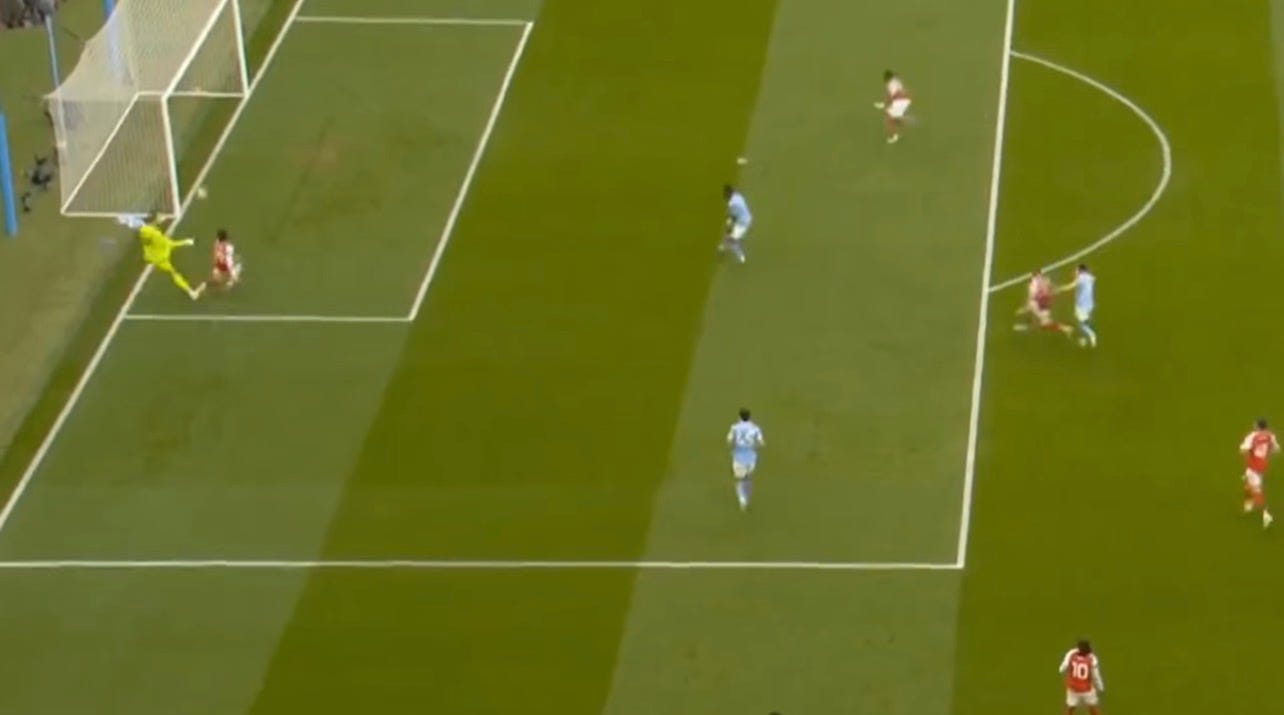 This is not an easy situation for a centre-back to handle, because if you leave your position and fail to block Haaland’s pass, you give the opponent a high way to goal. If you don’t, you risk being overloaded by both players. Rice managed to drop back and block the shot, but it was clear that Guardiola had done his homework. He prepared multiple ways to pull us out of shape.