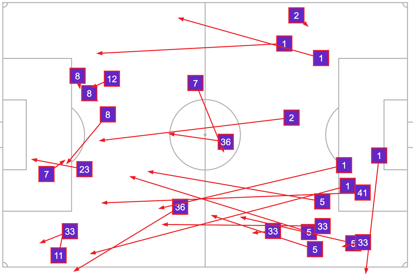 Having failed to kill the game off, we inevitably invited pressure. Spurred on by the “Dick on the Hill or whatever that name is” crowd, Everton threw the kitchen sink at us for the final 15 minutes, and we retreated into that familiar “heroic defensive mode”. Despite a bench packed with attacking quality, Arteta turned only to Merino and Martinelli to see it out. Why those two? It’s pretty obvious—they’re reliable for their defensive shift, and that’s clearly all the gaffer cares about in crunch time. He could have kept Eze on to try and snatch a second on the break, but he opted for the “safety first” out-of-possession specialists instead. We eventually scraped through stoppage time to the final whistle, with Raya hoofing it 60 yards at every opportunity just to kill a few more seconds. You can see by the picture above who were our most common offenders when it comes to losing the possession.