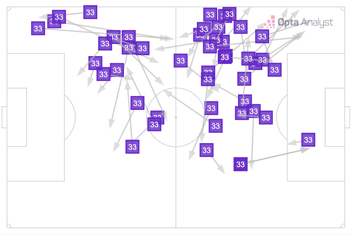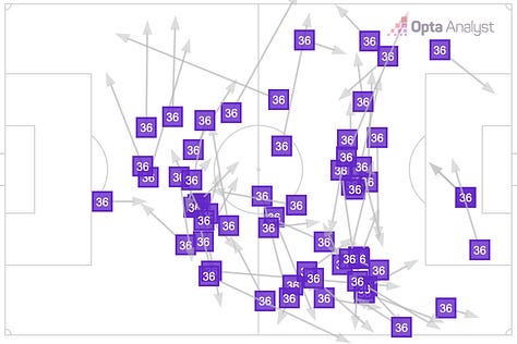 And it wasn’t just them. Calafiori, who came in for Hincapie to offer a bit more presence in the final third, didn’t disappoint either. He was basically acting as a fourth midfielder, popping up all over the shop in the middle of the park.