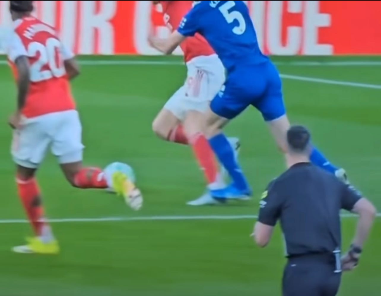 True to form, Havertz was drifting across the front line. He made a darting run into the box, found by Eze, only for Keane to bundle him over. At first glance, it looked like a bit of a shoulder barge, and even though it clearly knocked Kai off balance, I knew an English ref was never going to give that. They’re always looking for a blatant shove in the back or a leg trip. Little did I know, the replays would show there was actual contact on the leg.