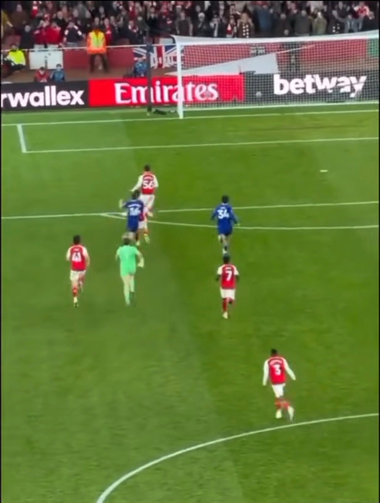 Max went for it, with his teammates trying to keep up. Martinelli did a proper job watching over Dowman and blocking off Mykolenko to block his last attempt to save Everton.