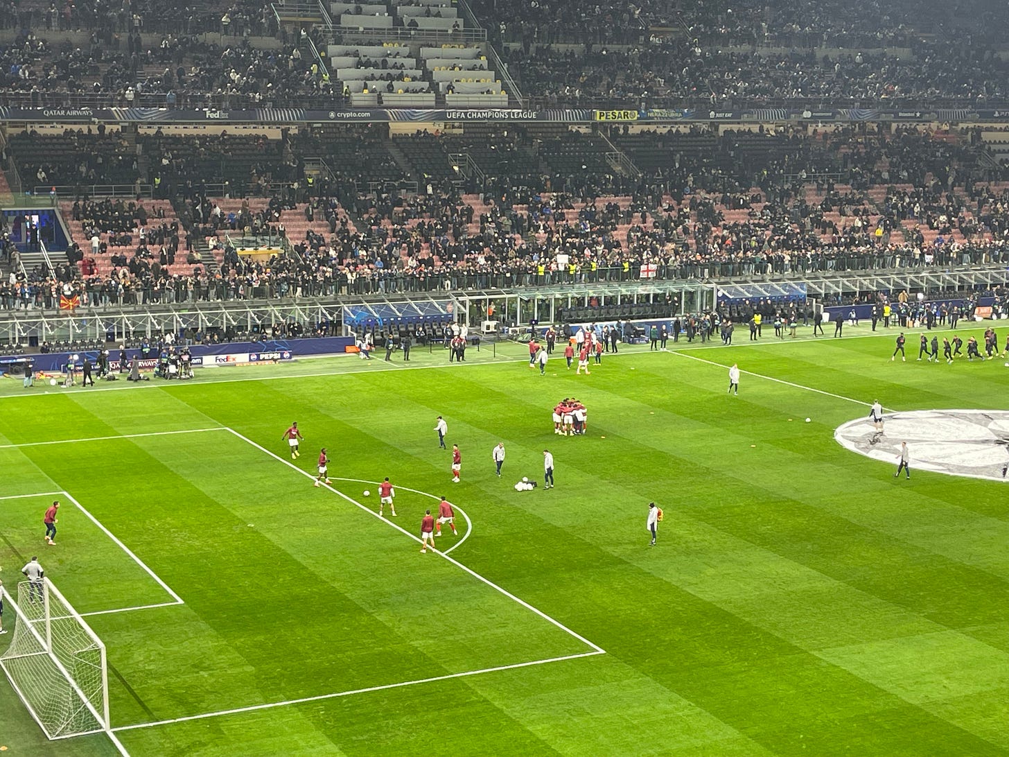 If I’m attending a match in person, I always try to watch the warm-ups closely to spot some hidden dynamics. The session at the San Siro kicked off with the goalkeepers putting in the work. As with my previous visits, I was blown away by David Raya’s distribution. He was pinging 50-metter balls into the opposition half that landed no more than a metre away from his target—Tommy Setford, in this instance. The return balls from Tommy weren’t anywhere near the level of precision David was producing.