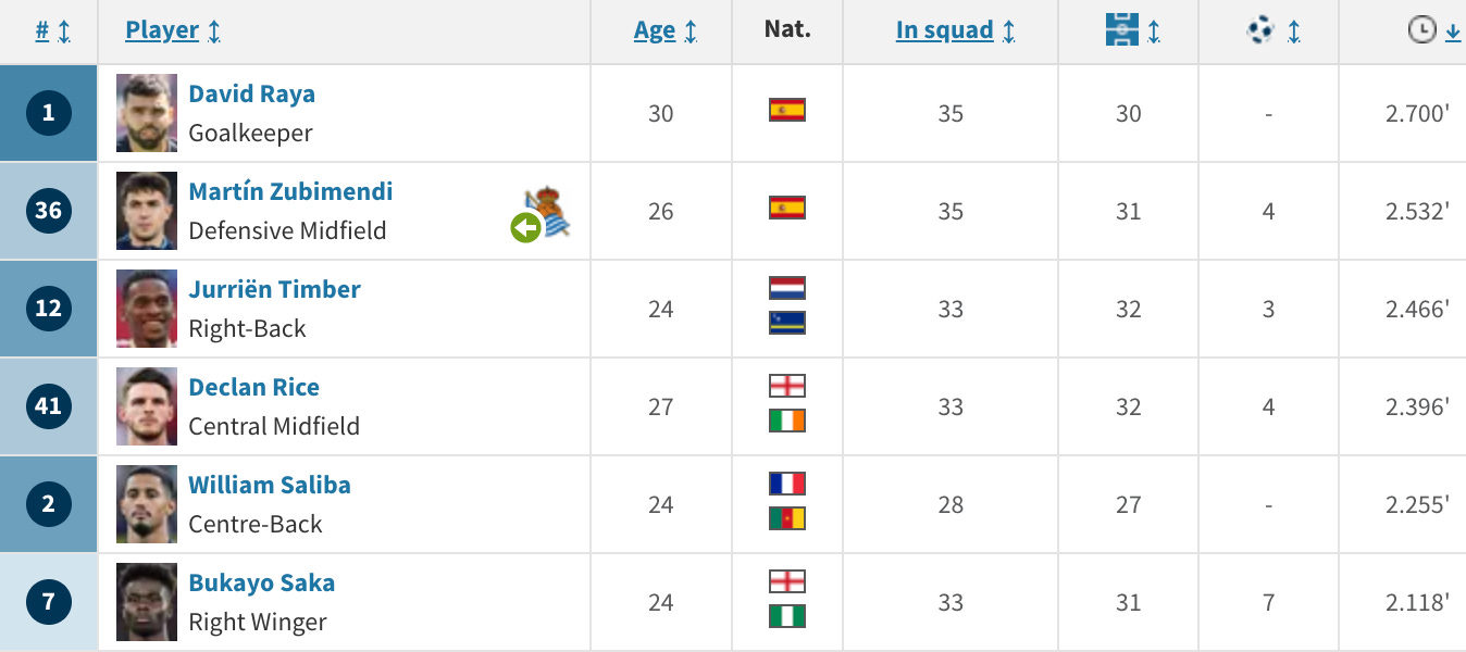 Norgaard has been nothing if not reliable this term, and I simply can’t find a logical reason why Arteta only uses him for the “lesser” games. The active January transfer rumours about him become especially baffling considering Zubimendi and Rice are sitting first and third in the list of outfield players for total minutes played.