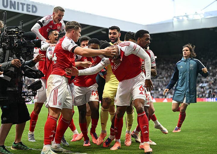 In the second half the aggression continued. Eze showcased his passing skills by finding yet another run, now directly from Gyokeres. Fair to say that we were lucky with Newcastle hitting the bar and not scoring their second. These feelings really got stopped mattering, when Trossard was clearly shoved in the back in Newcastle’s box. It’s really a penalty in 90 percent of games, especially in post-VAR era, but the ref decided to please the home crowd. In general he allowed all kinds of brutalities, as it usually happens on St James Park, the standards there a really different from the Emirates.