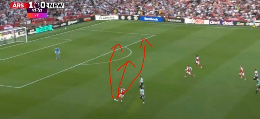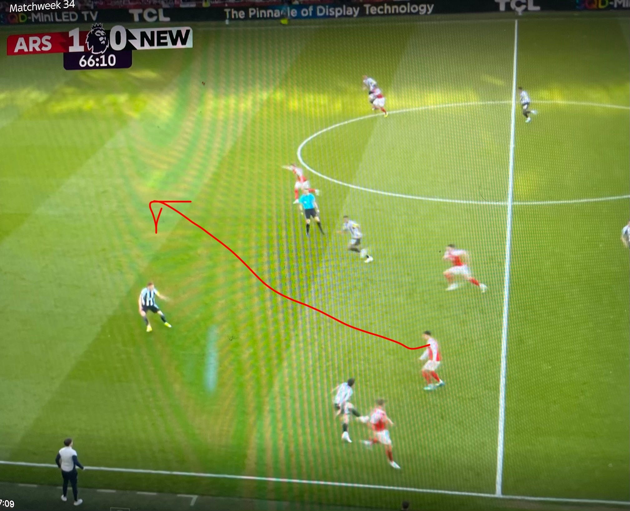 Then Gyökeres tracks a Newcastle man back into his own half and nicks the ball. The Emirates was about to erupt, the crowd was proper up for it. He gives it to Martinelli, who instead of picking out the two runners to ride the ecstatic wave, decides to keep the ball and passes it all the way back to the keeper.