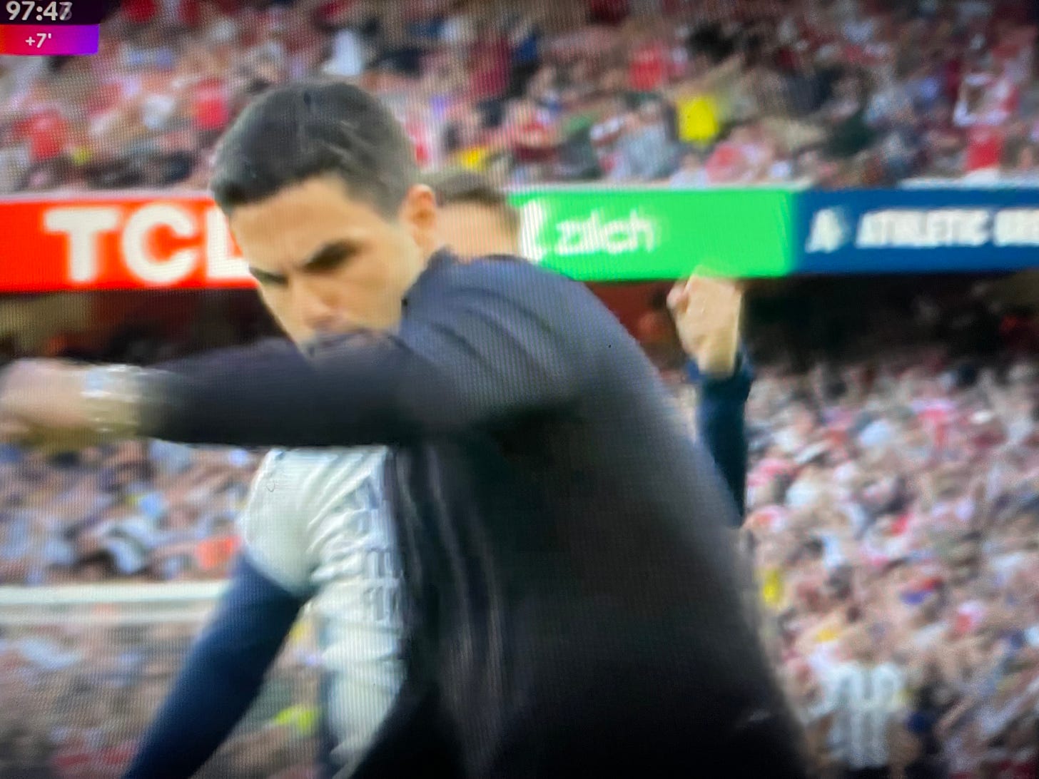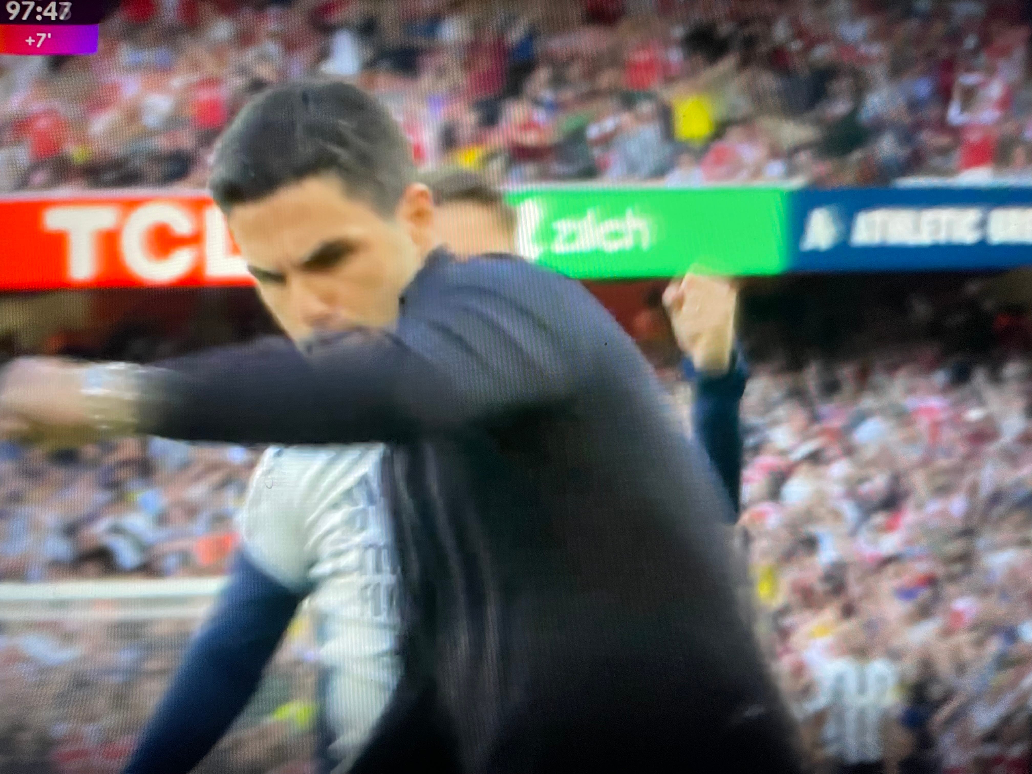 Winning 1-0 today is like scraping an away draw in a Champions League first leg. You’re still in it, but there’s a mountain to climb. Why didn’t Arteta celebrate like this after a 1-1 in Leverkusen? I don’t believe for a second this is the celebration of a man who set up in half time a goal for a team to be 3-0 up at the final whistle.