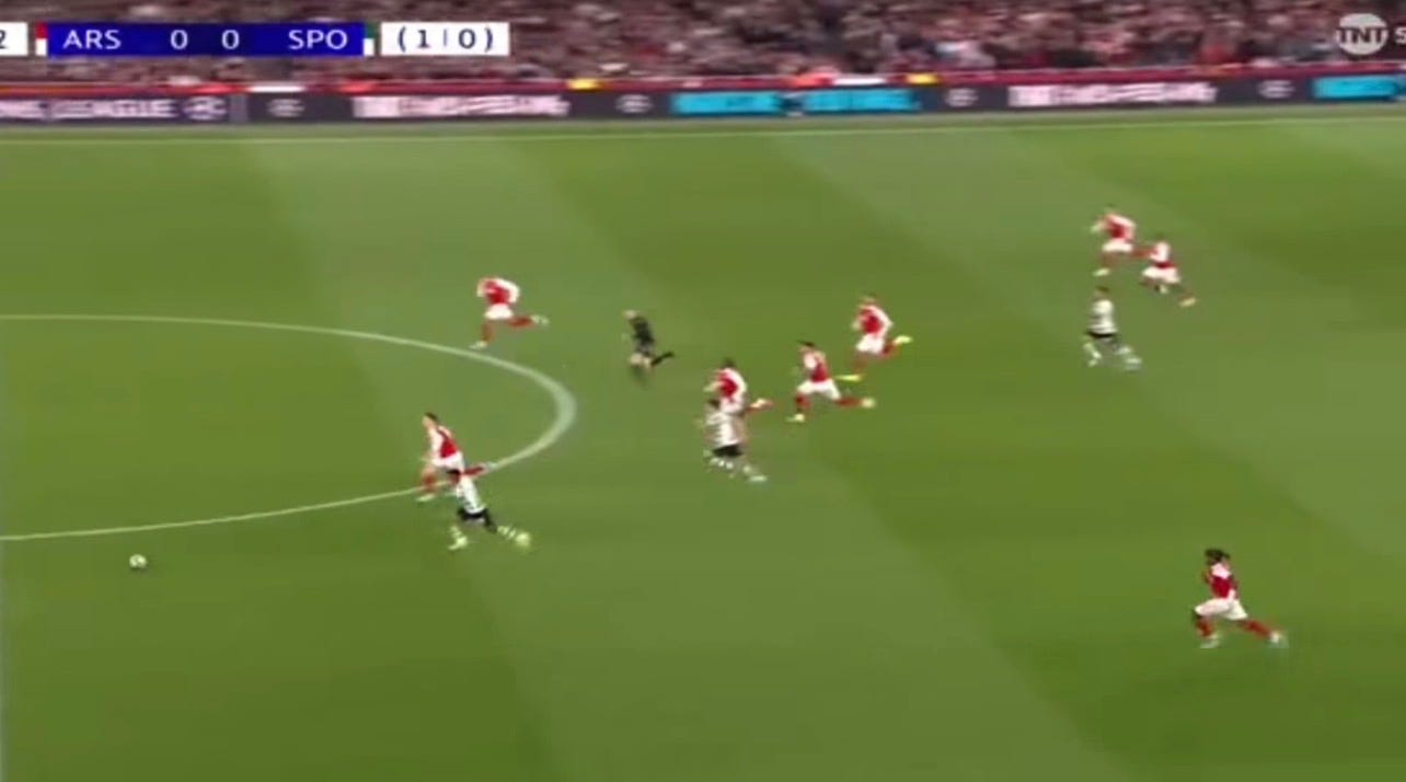 Despite our dominance, the two scariest moments actually came from Sporting. After all his great tracking back, Martinelli failed to spot the Sporting right-back raiding forward, who got into the box and sent the ball directly into the far post. Raya wasn’t in control of that one bit. But nearly-goals don’t count, so we kept trying to pick the lock.